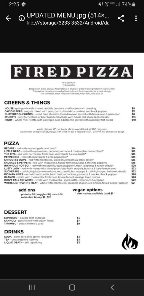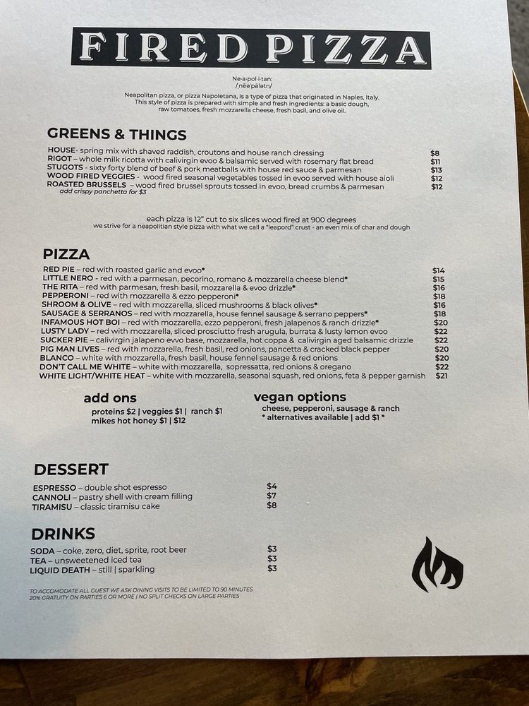 Introducing FIRED Pizza, located in Stockton, CA. This food truck turned brick-and-mortar gem offers a range of wood-fired pizzas with a Neapolitan style crust. The menu includes vegan and vegetarian options, paired with beer, wine, and creative cocktails. Customers rave about the Three Wise pizza drizzled with hot honey, the Lusty Lady topped with arugula, prosciutto, and burrata, and the Infamous Hot Boi with a flavorful kick. The seasonal specials menu keeps diners intrigued, while the cozy indoor seating and spacious outdoor patio create a vibrant dining experience. The friendly service, monthly specials, and commitment to quality make FIRED Pizza a must-visit for pizza enthusiasts. Whether enjoying the trendy decor, the clean facilities, or the cool vibes, this spot promises a memorable dining experience for all.